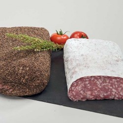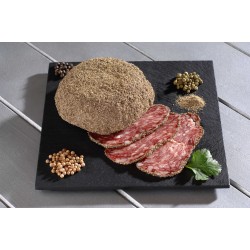 Produit très caractéristique de la Charcuterie Sèche , le Pavé au poivre PUR BOEUF perpétue la tradition d’une spécialité sèche avec une belle tranche généreuse, donc une texture plutôt souple réservée aux amateurs.